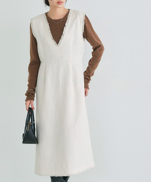 前後Vネックの抜け感あるデザインに、ウエスト切り替えとIラインシルエットで縦長効果を演出。裾や衿元にあしらったフリンジが、上品さの中にさりげないアクセントを添えます。インナー次第で表情を変えられ、きれいめにもデイリーにも着回せるアイテムです。