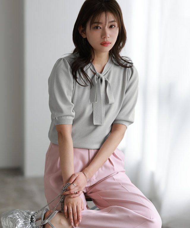 リボンがフェミニンなワンポイントになってくれるニット。インナーとしても着回しやすい一枚です。前後2wayで着用できるデザインなので、バックリボンにしてクルーネックで着用すると違った表情に。きれいめや上品なスタイルにおすすめです。