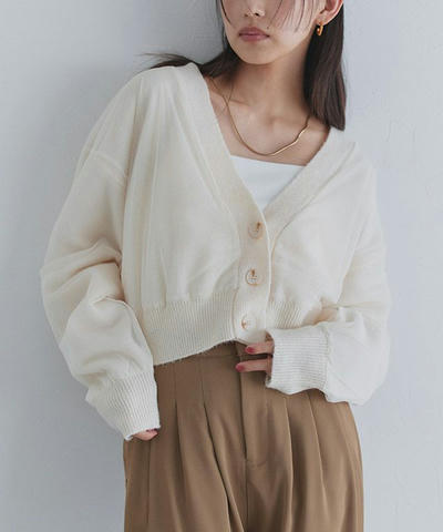 チュールレイヤードのデザインが着映え感を引き立てるニットカーディガン。クロップド丈が旬バランスを作り出します。首元はVネックですっきりと抜け感をプラスしました。