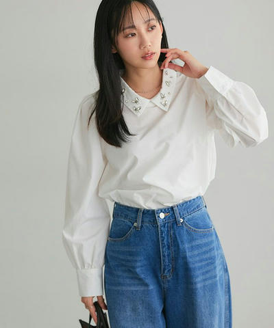 顔周りを華やかに演出する“ビジュー襟ボリュームスリーブブラウス”