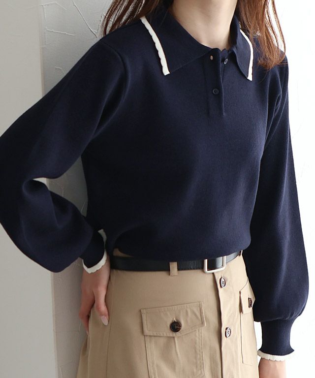 襟付きデザインにスカラップを施し、配色ラインでさりげなくアクセントをプラス。襟元と袖口に配色を効かせることで、シンプルながらも目を引くデザインに仕上げました。袖はボリューム感を持たせ、女性らしい立体的なシルエットを演出。一枚で着映えし、きれいめにもデイリーにも取り入れやすいアイテムです。