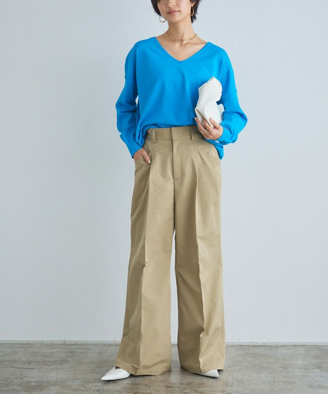 女性らしさを引き立てるキーネックは、程よい抜け感で顔まわりをすっきり見せてくれるデザイン。ウエストにはタックを入れ、気になる腰まわりをさりげなくカバーしながら上品な立体感を演出します。