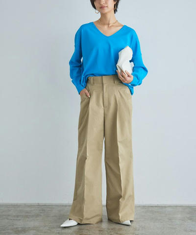 アクセントになったハイウエストデザインと、ハリがありながらも、柔らかさも備えたチノ素材の着心地の良さが魅力。目の詰まったきれい目の表面感が上品な印象へと導きます。程よくハリ感のある素材が綺麗なシルエットをキープします。