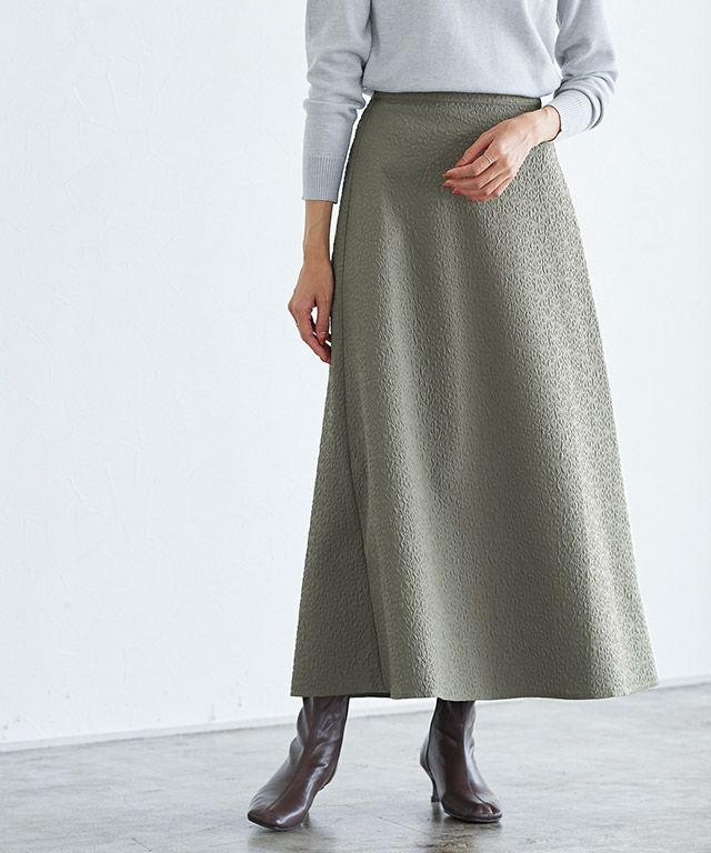 エンボス加工で表情のある生地感がアクセントになるスカート。花柄のようなエンボス加工なので、アクセントになりつつも女性らしさを漂わせます。