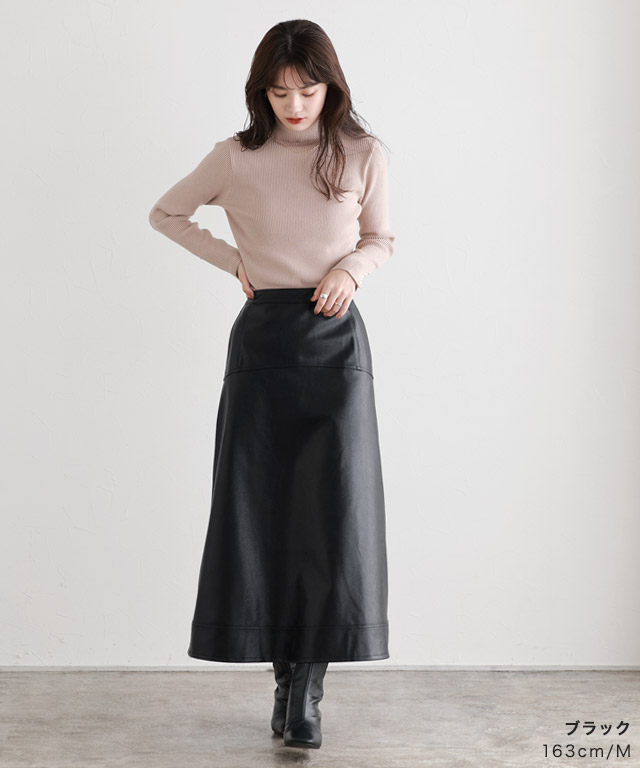 フレアシルエットなのでレザースカートも女性らしく着こなせます。シンプルなスカートだからこそ、前後の切り替えがアクセントに◎インスタイルもアウトスタイルも着回しやすい一枚。