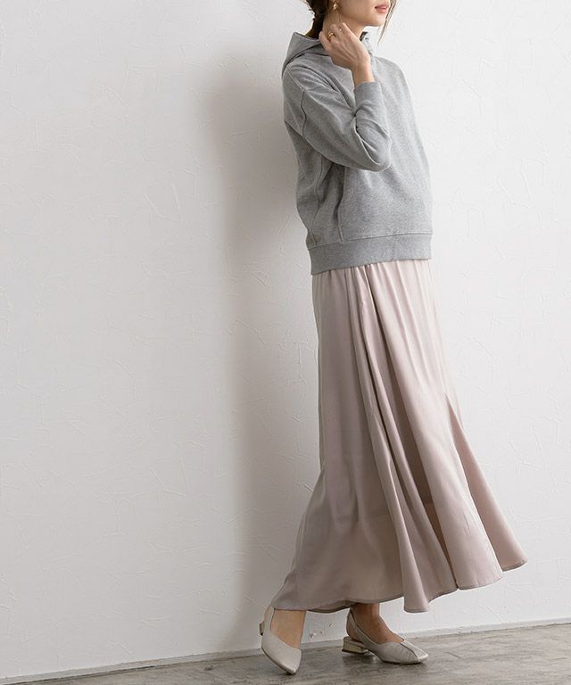 裾部分のみ切り替えを入れて裾に向かって広がるマーメイドラインに仕上げることで、女性らしい印象に◎フロントはフラットウエストにすることですっきりと着こなせ、後ろゴムが楽な着心地を叶えます。