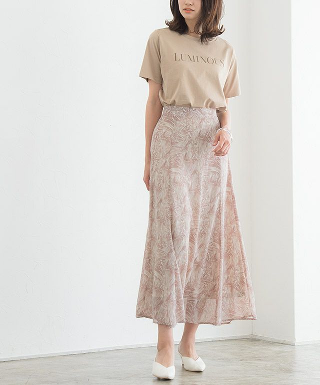 女性らしいセミフレアシルエットにトレンドのマーブル柄を落とし込んだ一枚。落ち着いたニュアンスカラーでどんなトップスとも合わせやすく普段のコーディネートを格上げします。