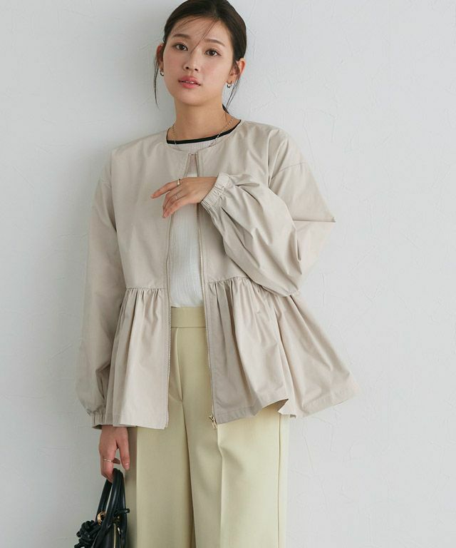 袖のシャーリングと裾のバルーンデザインで丸みのあるシルエットで、短すぎず長すぎない合わせやすい丈感が魅力。女性らしさの中に程良いカジュアル感のあるブルゾンです。