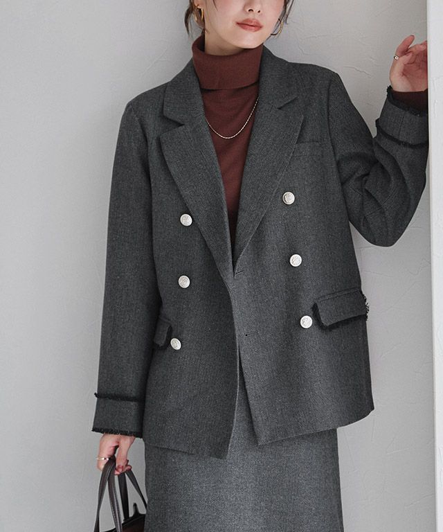 きちんと感のあるテーラードデザインと目を惹くボタン使いが上品さを演出する大人が似合う旬ジャケット。程よいサイズ感で着用しやすい一枚に仕上げました。ON/OFF着回しの効くアイテムでテイストを選ばず使いやすいです◎