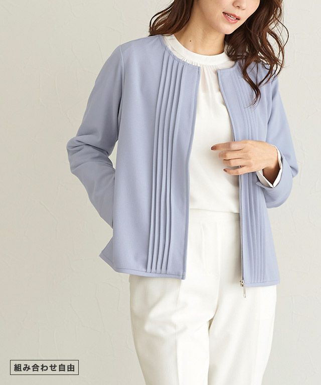 ファスナーに沿ったピンタックデザインが女性らしいきちんと感のある印象へ導き、スタイリングを格上げします。上品な印象でON/OFF着回せるアイテム。