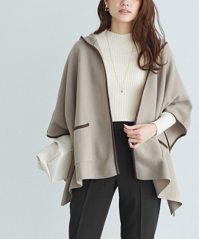 一枚で旬な装いに“パイピングフードケープ”