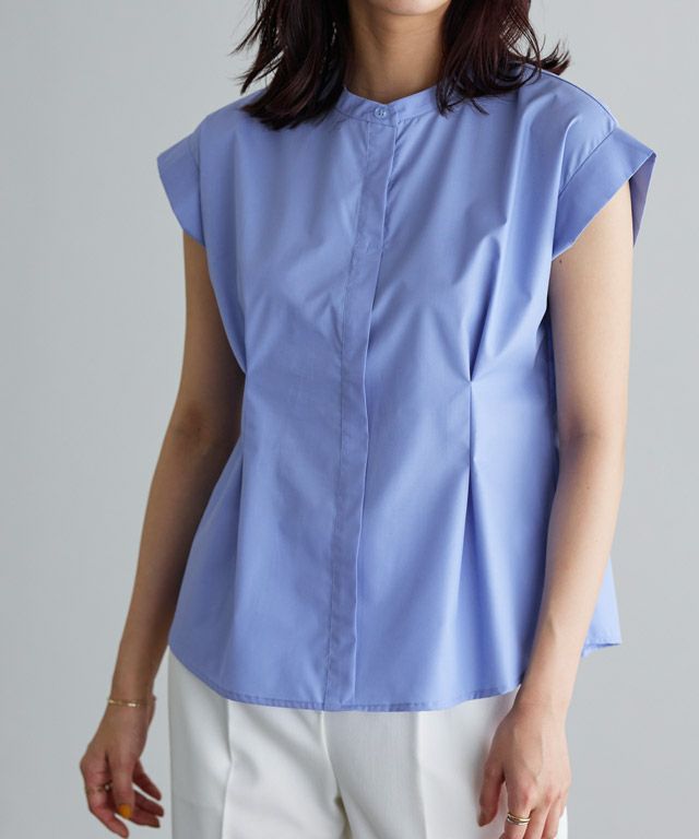 ウエストにタックを施したペプラムデザインが腰周りをカバーしながらも女性らしいシルエットを演出します。フレンチスリーブが程良く肩周りを隠してくれるところも魅力のひとつです。比翼のデザインと、首元のバンドカラーで全体をすっきりとした印象に。