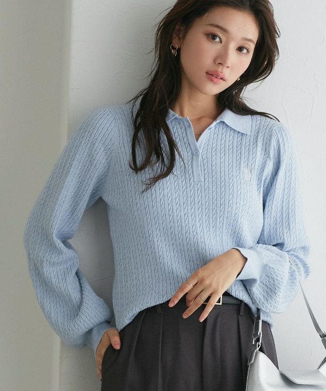 立体的なケーブルデザインを全面に施したポロニット。主張しすぎない細いラインで上品な印象へと導きます。レトロな印象のポロデザインに落とし込み、ボリュームのある袖が女性らしい雰囲気に。ボトムスを選ばず着回せるアイテムです。