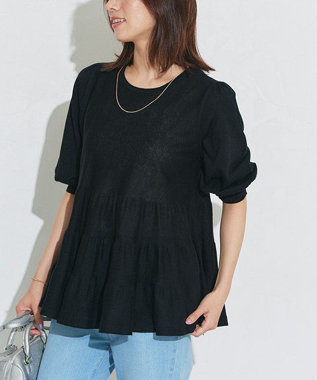 裾にかけてふんわりと広がるティアードデザインが目を惹く一枚。パフスリーブが女性らしさを引き立ててくれて、二の腕周りをさり気なくカバーしてくれるのも嬉しいポイント。オシャレしながら着痩せが叶う優秀なアイテムです。