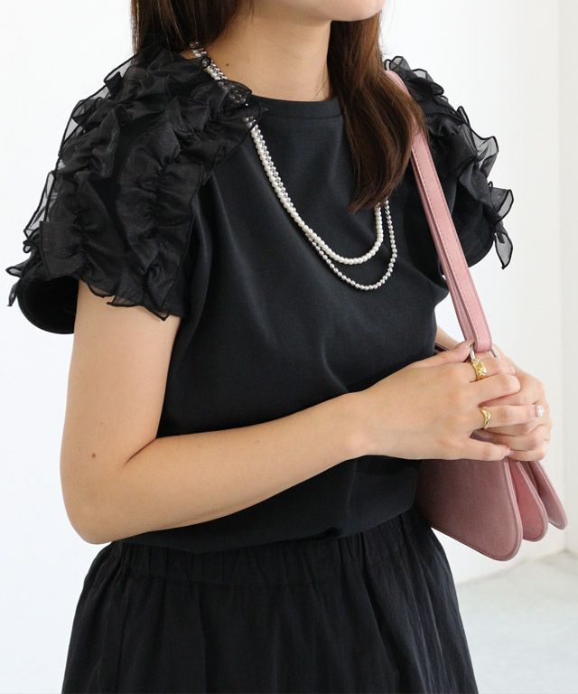 肩部分にはギャザーを寄せたフリルをあしらい、さりげなくフェミニンなアクセントをプラス。異素材で切り替えたシアー生地が軽やかさを演出し、シンプルながらも華やかな印象に仕上げました。