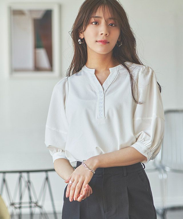 ふんわりとした立体感のあるボリュームスリーブが目を惹くブラウス。バンドカラーとスキッパーネックで顔周りをすっきりと見せてくれます。フロントボタンでアクセントを効かせた一枚です。
