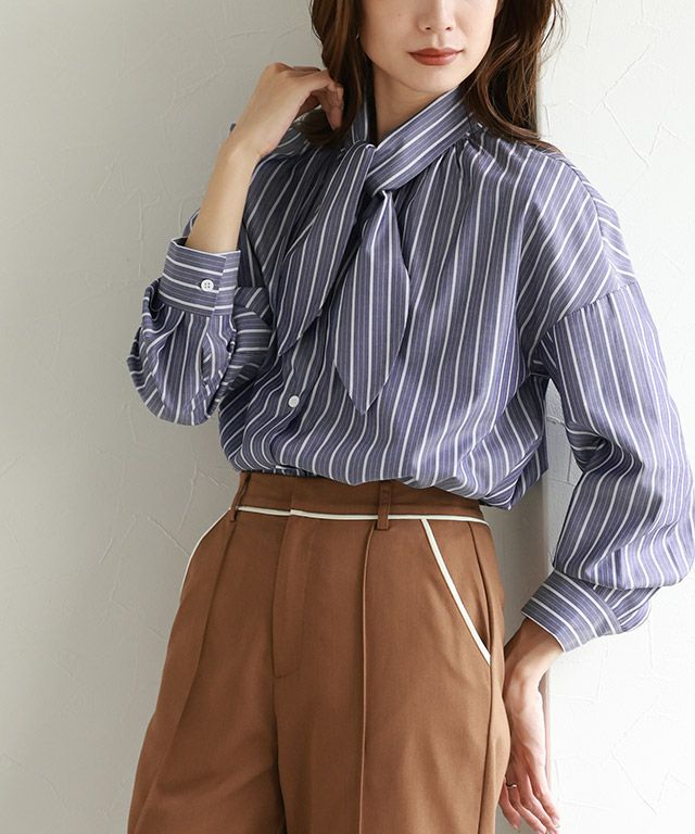トレンドムードを高めるストライプ柄とボウタイデザインが、女性らしいスタイリングに仕上がるブラウス。ボリュームスリーブが一枚でも着映えるアイテムです。ボウタイをはずしてバンドカラーブラウスとしても着用できます。