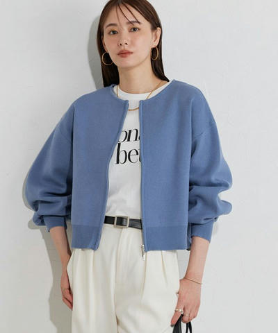 ダブルジップ仕様で着こなしの幅が広がり、開け方次第でシルエットに抜け感をプラスできます。袖はボリュームを持たせ、フェミニンな印象に。着丈を少し短めに設定しているので、スカートにもパンツにも合わせやすく、バランスよく着こなせる一枚です。