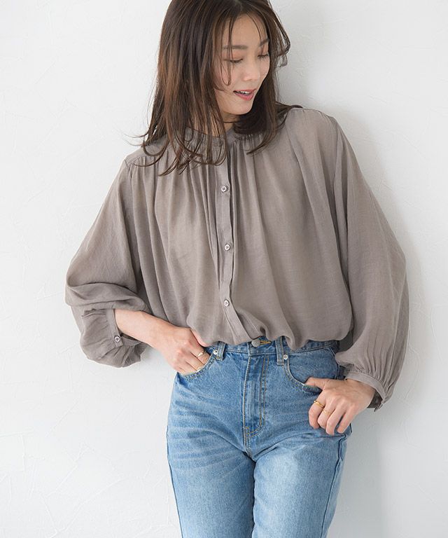 程よいバルーンスリーブで女性らしいシルエットを叶えながら、肩にギャザーをあしらい身頃にも表情のあるデザインに。トレンドのバンドカラーで旬なスタイリングが簡単に仕上がります。