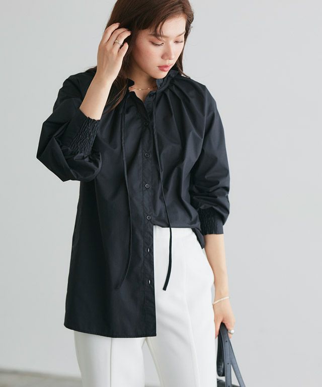 顔周りを華やかな印象へと導くスタンドフリルカラー。長めの着丈が体型カバーをしてくれるので、さらっと着用していただけます。袖デザインはややボリューム感を持たせ、袖口をシャーリングカフスにすることで、上げ下ろしをしやすいのもこだわりポイント。