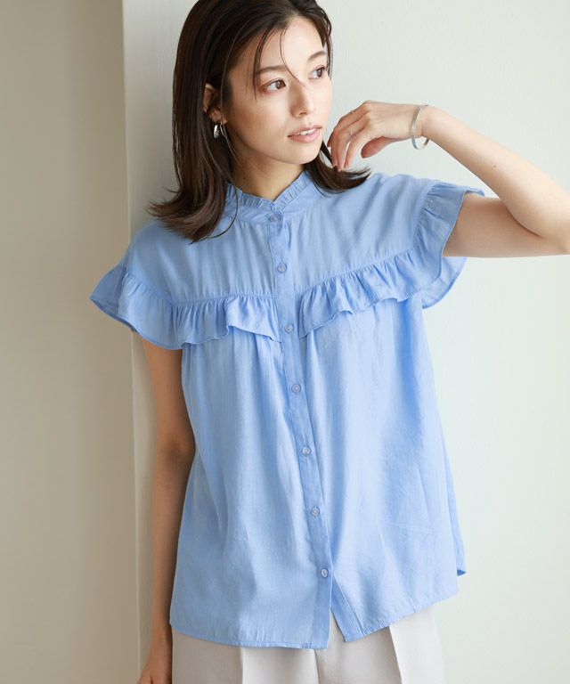 首や肩回りに施したフリルがスタイリングのアクセントになり、女性らしい大人な雰囲気を演出してくれる一枚です。