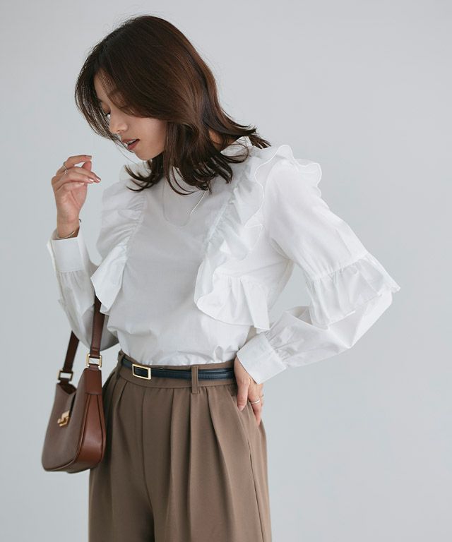 身頃と袖に施したフリルが、甘さのあるデザインながらも品良く、きれいめにもカジュアルにも着こなせる一枚。シンプルなボトムスに合わせるだけで、着映えてくれるアイテムです◎