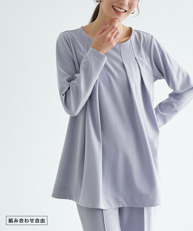 裾に向かってフレア感を持たせた女性らしいフェミニンデザイン。腰回りが隠れる丈感で体型カバーをしつつ、スタイルアップ効果も叶えます。上品な印象でON/OFF着回せるアイテムです。