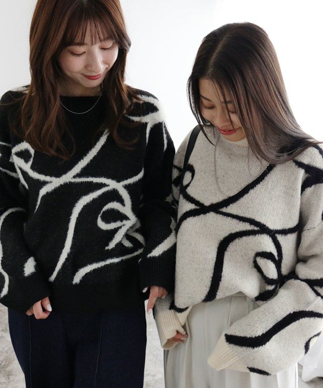 リボンモチーフがトレンドライクなジャカードニット。大きめのリボンと線画が甘すぎない大人な雰囲気に仕上げてくれます。スカートでフェミニンなコーデはもちろん、ワイドパンツやデニムなどでカジュアルに外したスタイルもおすすめ。取り入れるだけで旬なスタイルに仕上げてくれる一枚です。