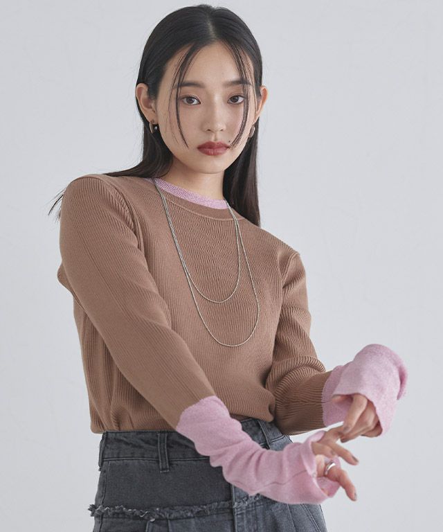 レーヨン混のやわらかな風合いが上品なニット素材。細めのリブ編みが表情をプラスします。袖とネックの配色部分は程よい透け感のラメ素材でアクセントをプラス。