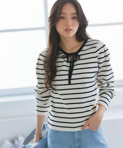前後2wayで着用でき、スタイリングに合わせて表情を変えられる一枚。襟元からリボンへと続く配色デザインが、さりげないアクセントに。袖は程よくパフ感を持たせ、女性らしいやわらかな印象に導きます。一枚で着映えするデザインながら、甘くなりすぎず、デイリーにも取り入れやすいバランスに仕上げました。