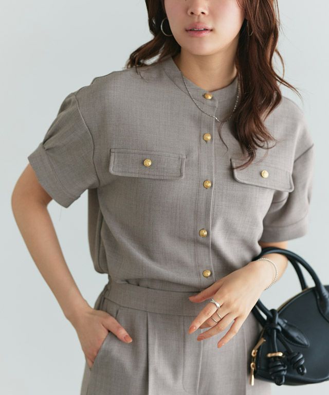 ゴールドボタンとフラップデザインが可愛いブラウス。ボリューム袖が女性らしい印象に導いてくれて、気になる二の腕もカバーしてくれます。同素材のパンツやスカートと合わせてセットアップとしてもお召しいただけます。