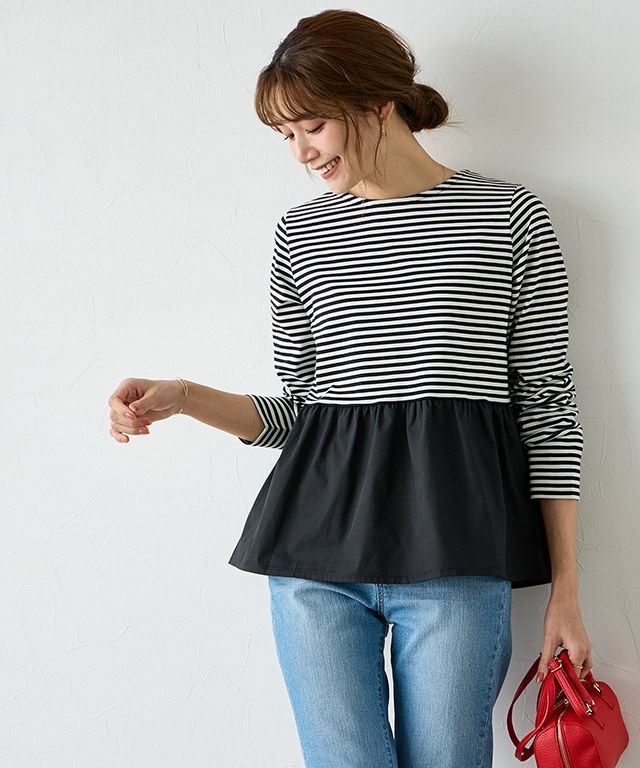 フェミニンで女性らしさ漂う“異素材ドッキングフリルギャザーカットソー”
