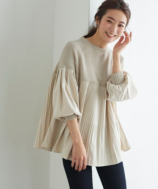 布帛で切り替えたプリーツを施し、一枚でサマ見えするニットに仕上げました。