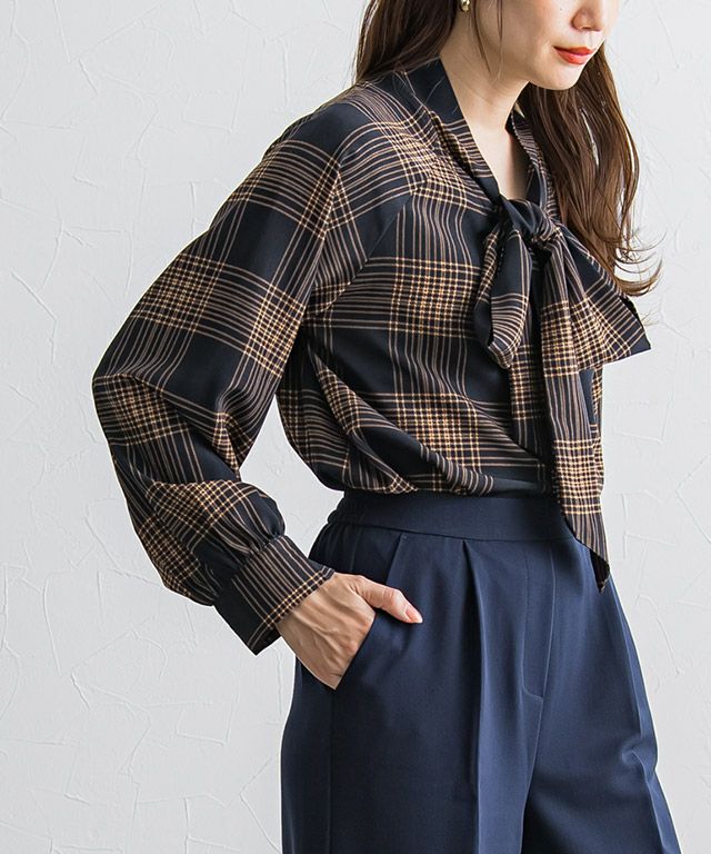 ボリューム感のあるボウタイは前リボン結びでレディに、後ろリボンにしてハイネックとして着るのも大人シックに決まります。マルチに結び方を変えられる仕様なので、スタイリングの幅が広がります。袖に程良くボリュームを持たせ、全体シルエットも華やかに。きれいめのパンツ・スカートに合わせた通勤、お呼ばれシーンや、デニム合わせのデイリーカジュアルまで、旬なスタイリングに活躍するマストアイテムです。