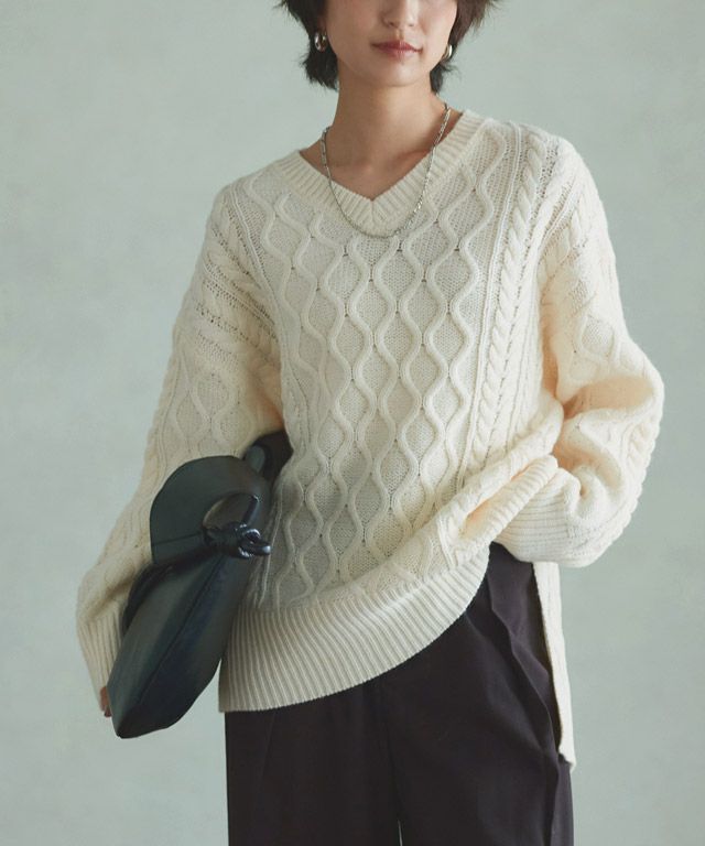 立体感のあるケーブル柄は表情豊かで、サマ見えする一枚。サイドの編みの切り替えとフロントのスリットが程よくスタイリングのアクセントに。