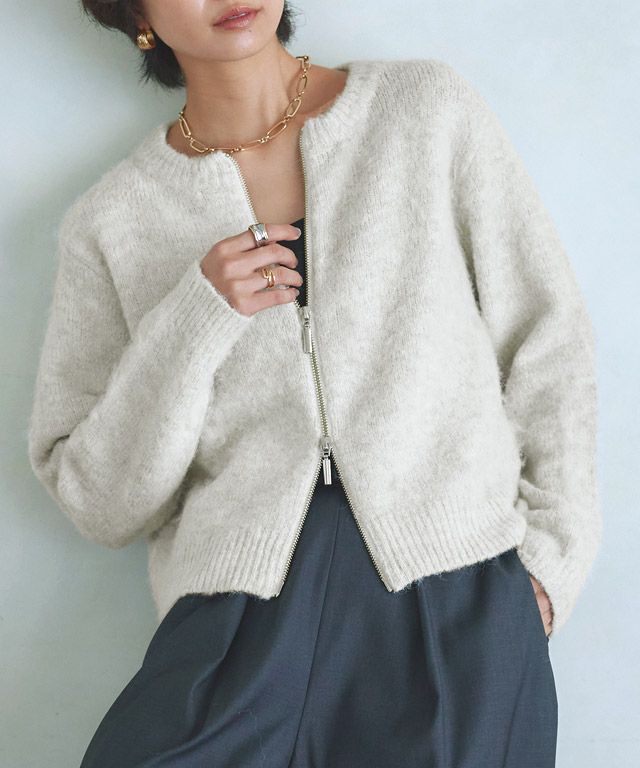 Wジップ仕様で、スタイリングの幅が広がる仕様に仕上げました。着丈はトレンドライクなやや短めのシルエットながらも、程良く体のラインを隠してくれる一枚。