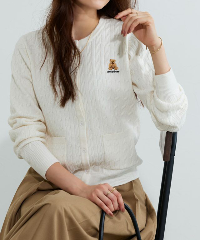 立体感のあるケーブルデザインを全面に施したカーディガンは、細めのラインで主張しすぎず上品な印象に。胸元のTeddyBear刺繍がさりげないアクセントとなり、トレンド感もプラスしてくれます。ベーシックなシルエットなのでアウターとも合わせやすく、ボトムスを選ばず幅広く着回せる万能な一枚です。