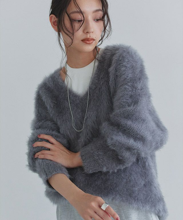 ボリュームのあるシャギー素材とロング丈がバランスがよく、気になる体型をカバーしながらも、シーズンムードあるスタイリングに導きます。すっきりとしたVネックが抜け感のあるデザインです。