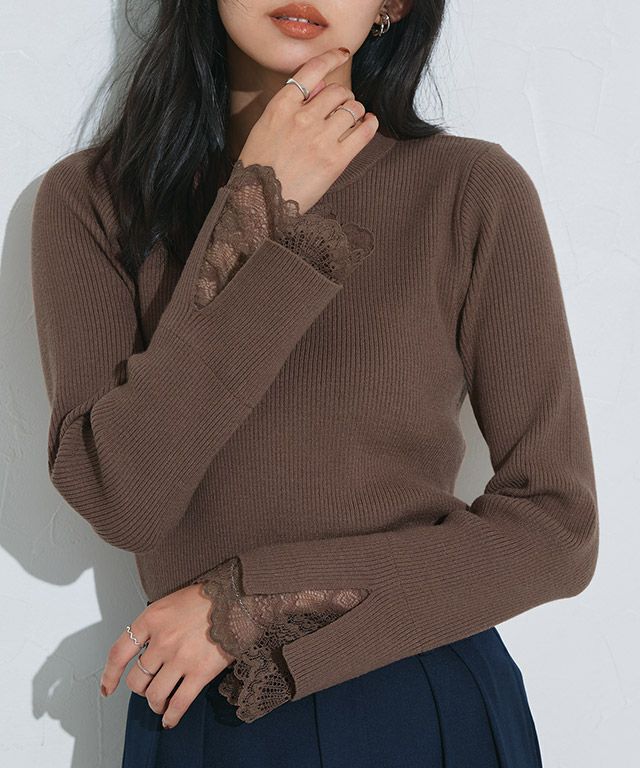 もちもちとした肌触りの良いニット素材を使用し、なめらかな着心地。袖先から覗くレースが、スタイリングを華やかに引き立ててくれます。